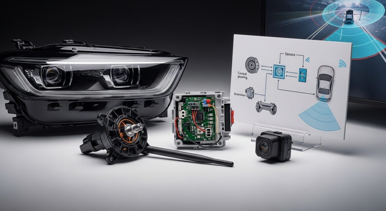 Aby systemy ADAS mogły działać skutecznie, potrzebują „oczu”, „uszu” i „mózgu”. Tę rolę pełnią różnorodne czujniki, kamery i jednostki sterujące, które zbierają i przetwarzają dane o otoczeniu pojazdu w czasie rzeczywistym.